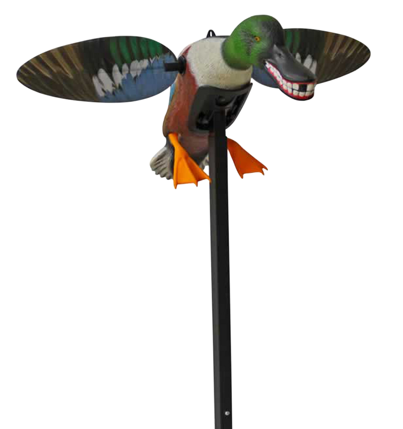 The Mojo Elite Series Spoonzilla is a motorized duck decoy designed to simulate realistic mallard drake movement in water. This molded plastic decoy features motion activation powered by AA batteries and measures 17.2" long × 6.9" wide × 6.3" tall, making it effective for waterfowl hunting applications.