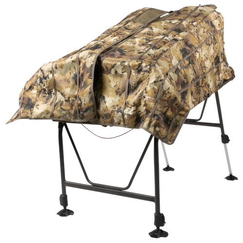 The Invisi-Lab is a dog blind designed to keep retrievers hidden and comfortable in field or water settings with adjustable leg heights from 0-34 inches. Independently adjustable legs provide stability, while the mesh bottom allows water drainage and offers a comfortable sling bed. Weighs 17 lbs and is suitable for training and hunting use.