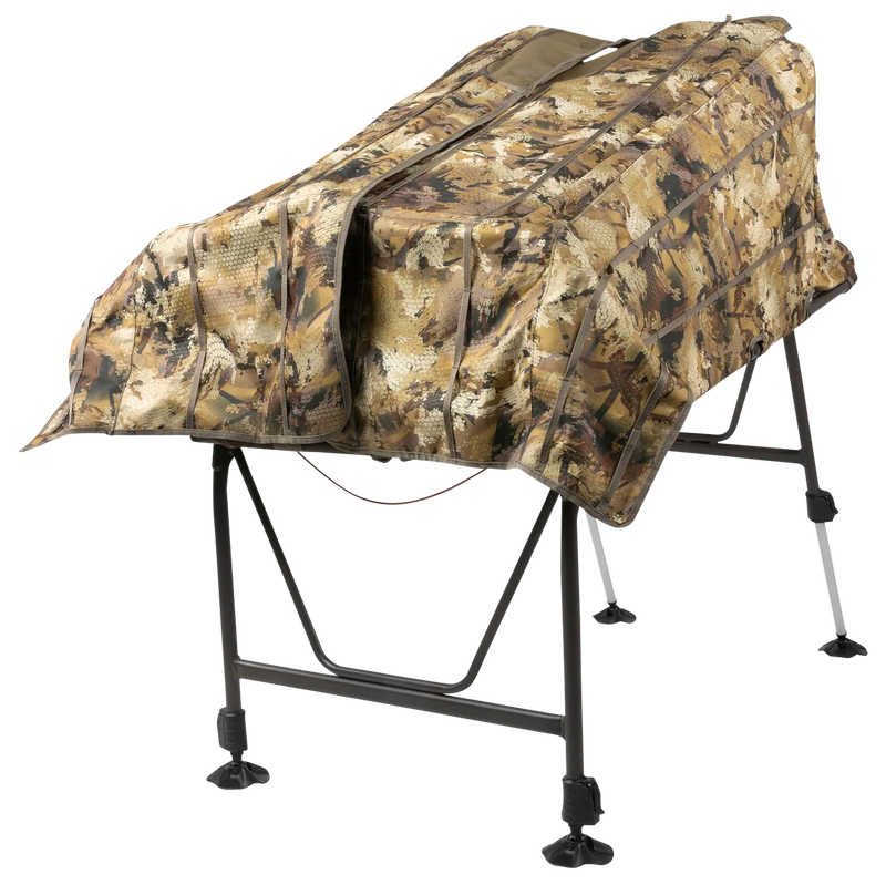 The Invisi-Man is a versatile sitting blind designed for hunters in various terrain conditions, from dry ground to 30 inches of water. It features a lightweight design with dimensions of 47.5" L x 29" W and weighs 27 lbs, bridging the gap between vertical and horizontal cover options. The blind comes in Mossy Oak Original Bottomland camouflage pattern and is compatible with the Invisi-Lab dog blind for coordinated hunting setups.