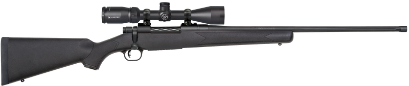 The Mossberg Patriot is a bolt-action rifle chambered in .300 Win Mag with a 24" fluted, threaded barrel and 3+1 capacity. This combo package includes a Vortex Crossfire II 3-9x40mm scope mounted on Weaver-style bases, adjustable LBA trigger, and a black synthetic stock. Weighs 6.5 lbs with an overall length of 44.75" and features a spiral fluted bolt and recessed crown.
