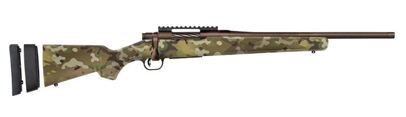 The Mossberg Patriot Super Bantam is a bolt-action rifle chambered in 350 Legend with an 18" threaded bull barrel and 4+1 capacity, designed for smaller-statured and youth shooters. Features include a Patriot Brown Cerakote steel receiver with Picatinny rail, MultiCam synthetic fixed stock with adjustable length of pull via removable spacer, spiral fluted bolt, and drop box magazine. Weighs 6.5 lbs with an overall length of 40.5".