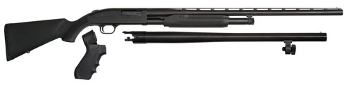 The Mossberg 500 Field is a 12 gauge pump-action shotgun with a 3" chamber, 28" ventilated rib barrel, and 5-round capacity. It features Accu-Set choke tubes, dual bead sights, and a black synthetic stock. This all-purpose hunting shotgun weighs 7.5 lbs and measures 47.5" overall.