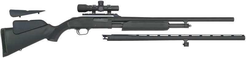 This Mossberg 500 is a 20 gauge pump-action shotgun with dual barrels: a 26" vent rib barrel for field use and a 24" rifled slug barrel for deer hunting. It features a 5+1 capacity, synthetic dual comb stock, Accu-Set chokes, and comes with an integrated scope mount and 2.5x20mm Dead Ringer scope, weighing 7.25 lbs.