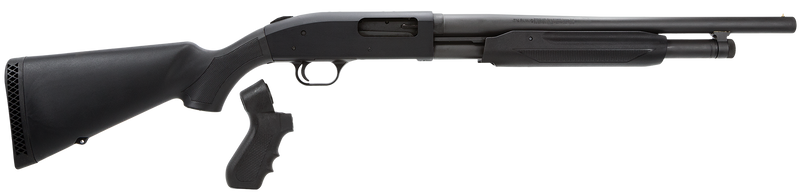 The Mossberg 500 Special Purpose is a 12 gauge pump-action shotgun with an 18" barrel and 5+1 capacity, featuring a parkerized metal finish and synthetic stock. It includes dual bead sights, Accu-Set chokes with fixed cylinder configuration, and an aluminum receiver. This compact 7.5 lb shotgun is designed for personal protection and sport shooting, and comes with an exclusive pistol grip kit.