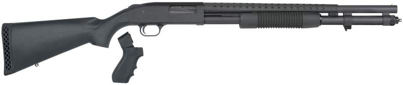 The Mossberg 590 Persuader is a pump-action 12-gauge shotgun with a 3" chamber, 20" cylinder bore barrel with heat shield, and 8+1 capacity. It features a matte blued finish, fixed black synthetic stock, and includes a pistol grip kit for tactical versatility. Weighing 7.75 lbs with bead front sight, this defensive shotgun is built with dual extractors and twin action bars for reliable performance.