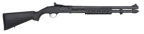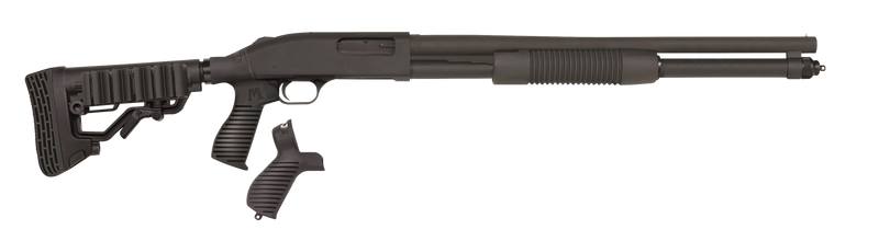 The Mossberg 590 Tactical is a 12 gauge pump-action shotgun with a 3" chamber, 20" cylinder bore barrel, and 8+1 round capacity, featuring a matte blued metal finish and bead front sight. It includes a FLEX 6-position adjustable stock with FLEX pistol grip and dual extractors for reliable operation. Weighing 7.75 lbs with an overall length of 37.75", this tactical shotgun is designed for home defense and professional use.