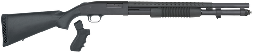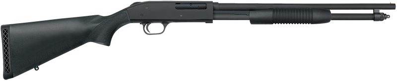 The Mossberg 590 Persuader is a pump-action shotgun chambered in .410 bore with an 18.5" cylinder bore barrel and 6+1 capacity. Features a matte blued metal finish, synthetic stock, and bead front sight on a drilled and tapped receiver. This compact defensive shotgun weighs 7 lbs with an overall length of approximately 40-43".