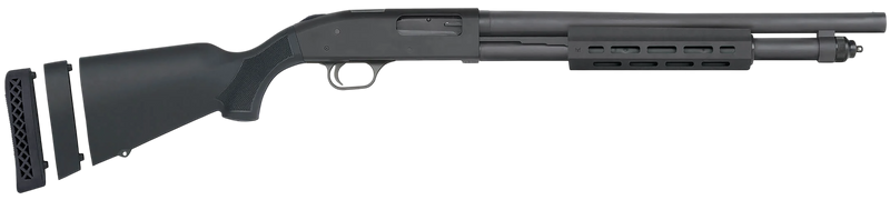 The Mossberg 590A1 is a 12 gauge pump-action shotgun with a 3" chamber, 18.5" heavy-walled barrel, and 6+1 capacity. It features a black parkerized finish, drilled and tapped receiver for optics mounting, M-LOK forend, fixed black synthetic stock, and cylinder bore choke. Weighing 7 lbs with an overall length of 37.75", it is designed for home defense and duty use with proven military and law enforcement service.