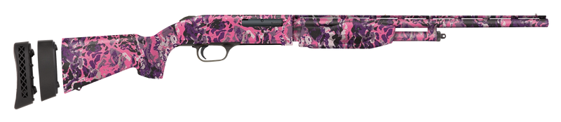 The Mossberg 510 Mini Super Bantam is a .410 gauge pump-action shotgun with an 18.5" vent rib barrel and 2+1 capacity. It features a 3" chamber, adjustable length of pull (10.5"-11.5"), dual bead sights, and a fixed modified choke. The synthetic stock in Muddy Girl Wild camo with spacer and steel receiver make it lightweight at 5 lbs, ideal for youth and smaller-framed shooters.
