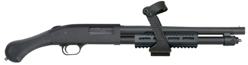 The Mossberg 590 Shockwave is a .410 Bore pump-action shotgun with a 14.38" heavy-walled barrel, 5+1 capacity, and 26.37" overall length that does not require an NFA tax stamp. It features a Raptor bird's head grip, front bead sight, cylinder bore choke, and drilled and tapped receiver for optic mounting. This tactical shotgun weighs 4.24 lbs and is finished in matte blue with a black synthetic stock.