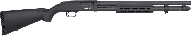 The Mossberg 590S Tactical is a pump-action shotgun chambered in 12 Gauge with a 20" barrel and 13+1 capacity. It cycles 1.75", 2.75", and 3" shells interchangeably and features an optic-ready receiver, dual extractors, twin action bars, anti-jam elevator, top-mounted ambidextrous safety, and fixed black synthetic stock. Weight is 7.25 lbs with an overall length of 41".