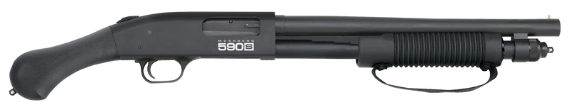 The Mossberg 590S Shockwave is a 12 gauge pump-action shotgun with a 14.38" barrel, 3" chamber, and 8+1 capacity, featuring a Shockwave pistol grip and bead front sight. This model cycles 1.75", 2.75", or 3" shells interchangeably and weighs 5.3 lbs with an overall length of approximately 26.37" to 30.75" depending on configuration. The matte blued steel barrel and black synthetic construction make it a durable, non-NFA short-barreled option for defensive use.
