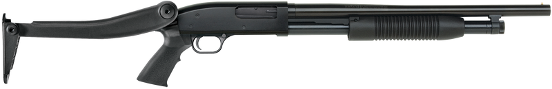 The Maverick Arms 88 Security is a pump-action 12 gauge shotgun with an 18.5" blued barrel and 5+1 round capacity. It features dual extractors, an anti-jam elevator, fixed cylinder bore choke, bead front sight, cross-bolt safety, and an ATI Shotforce top-folding synthetic stock. The firearm weighs 6 lbs with an overall length of 39.5" and chambers 3" magnum rounds.