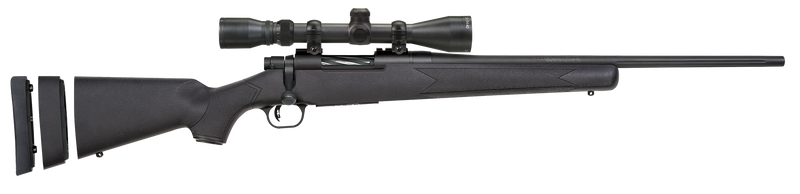 This Mossberg Patriot Super Bantam is a compact bolt-action rifle chambered in .308 Winchester with a 20" fluted barrel and 5+1 capacity, designed for youth and smaller-framed shooters. Features include an adjustable length-of-pull synthetic stock (12-13" spacers included), LBA adjustable trigger, and Weaver-style bases drilled and tapped for optics. Package includes a 3-9x40mm variable scope mounted and ready to shoot, with overall length of 38.5" and weight of approximately 7.5 lbs.
