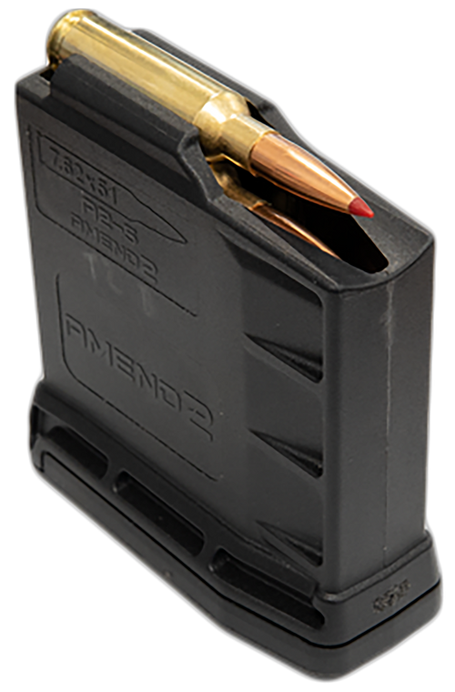 Detachable drop box magazine for Mossberg Patriot and 4x4 short action rifles chambered in .243 Win, .308 Win, 7mm-08 Rem, and 6.5 Creedmoor. Holds 5 rounds and features black polymer construction. Not compatible with Patriot LR Tactical models.