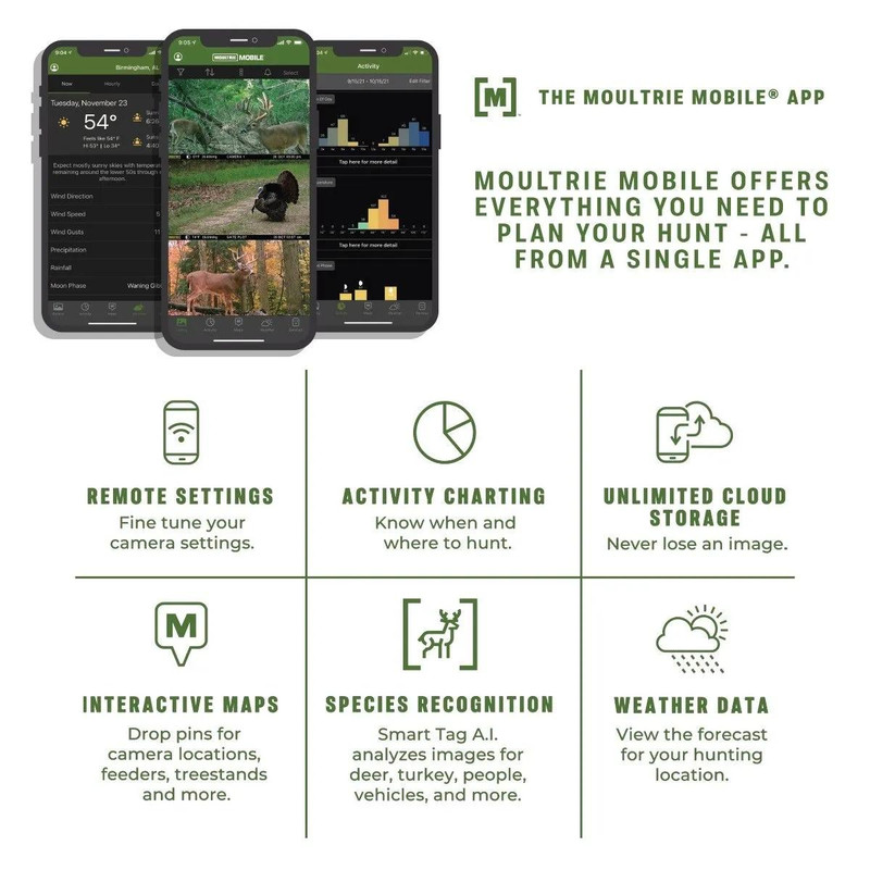 The Moultrie Edge Pro is a cellular trail camera with 36MP image resolution and 1080p video capability, featuring False Trigger Elimination Technology to reduce non-target species triggers by over 95 percent. It uses Nyxel NIR technology for clear low-light images, includes a 100 ft PIR sensor and IR night range, and connects via the Moultrie Mobile App with cloud storage capability. The camera mounts via strap or 1/4-20 threaded connection and operates on 8 or 16 AA batteries (alkaline or lithium), with optional solar panel compatibility.