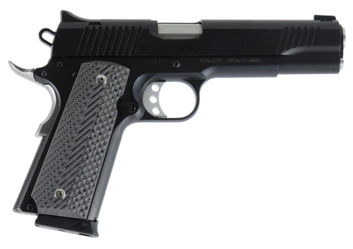 The Magnum Research Desert Eagle 1911 is a semi-automatic pistol chambered in .45 ACP with a 5.055" barrel and 8.625" overall length. This Shooter's Model features high-profile sculptured rear sights, a 3-4 lb trigger pull, and weighs 36.2 oz. It may exhibit minor finish imperfections from manufacturing but is 100% new in box.