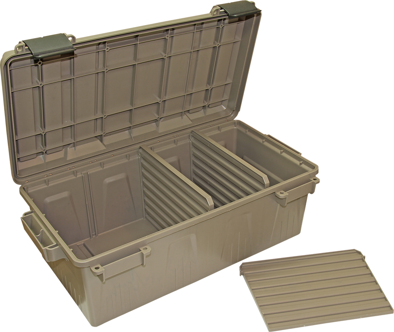 This MTM Ammo Crate features a divided utility design with removable partitions to accommodate multiple storage configurations. The water-resistant polypropylene construction measures 21" x 11.2" x 7.5" and is designed for stackable storage of ammunition and gear, with capacity to hold four 30-caliber cans under one lid.