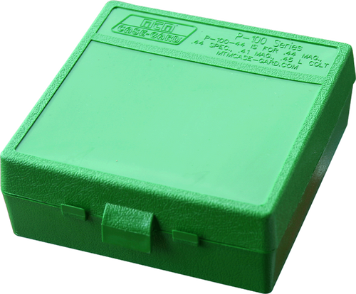 MTM Case-Gard P-100 is a multi-caliber handgun ammunition storage box with a flip-top design, constructed from durable clear green polypropylene. This 100-round capacity box is suitable for organizing and storing various handgun cartridges and is ideal for range use and ammunition organization.