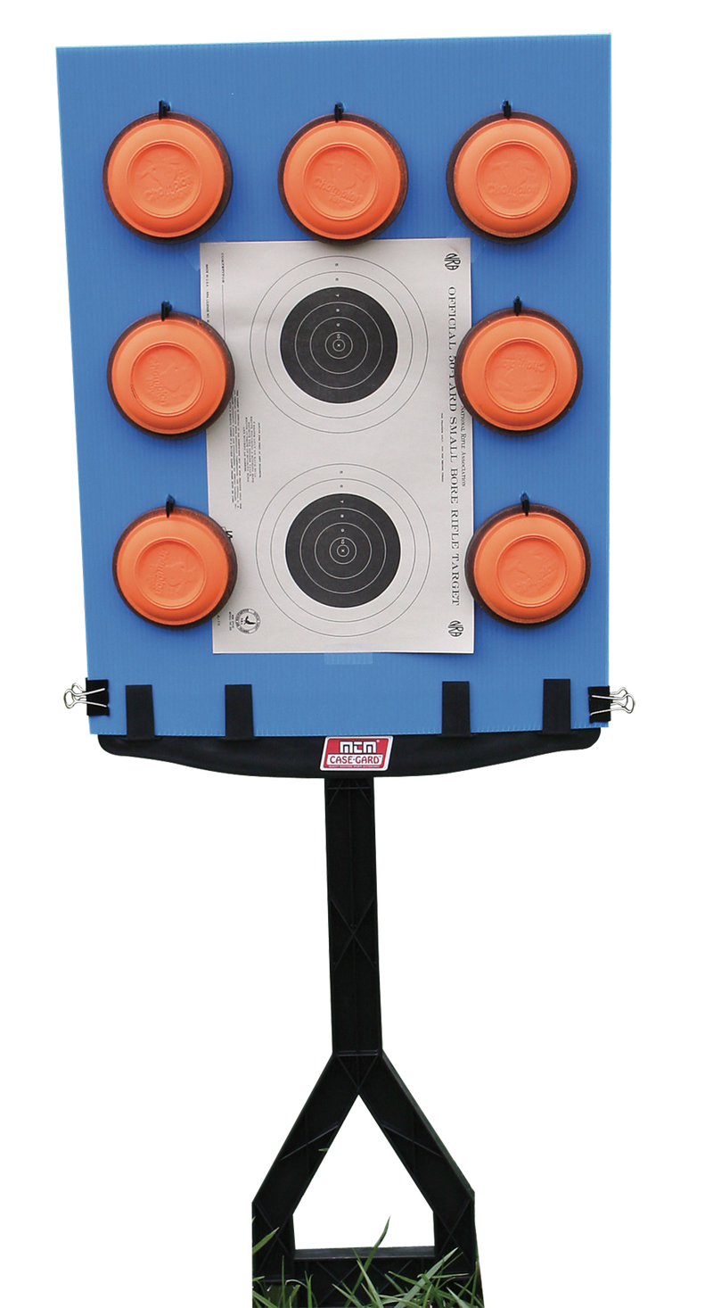 The MTM Jammit Target System is a lightweight plastic standing target stand designed for both handgun and rifle practice. It includes an 18-position Easy-Load Bird Board clip system, ground stakes for stability, and holds up to nine full-size clay targets. The stand weighs less than 2 pounds, sets up quickly, and stands stable on level or uneven terrain.