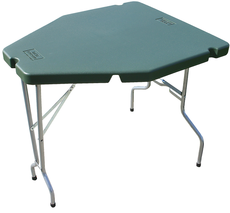 The MTM Predator Shooting Table is a lightweight polymer shooting bench designed for both left and right-handed shooters with a wedge-shaped tabletop surface. Measuring 35" L x 28" W x 30" H, it weighs less than 18 lbs and folds compactly for transport and storage. The table features four rubber feet for stability and is suitable for range shooting and gun rest applications.
