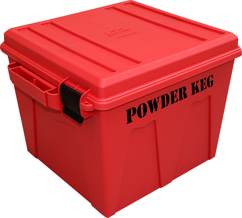 The MTM Powder Keg is a polypropylene plastic storage container designed for organizing and safeguarding factory-packaged reloading powder. It features a bright red color for easy identification, side-mount snap latches, large handles for transport, and padlock tabs for security. The stackable design accommodates various powder container sizes including two 8 lb. containers, one 4 lb. container, and several 1 lb. containers.