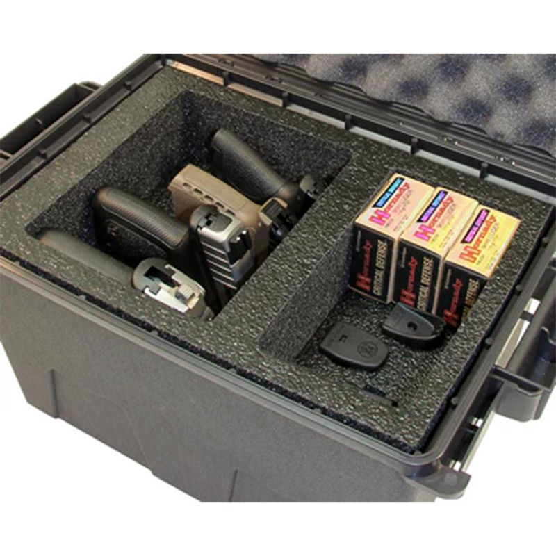 This case stores and transports up to 4 semi-automatic handguns with individual compartments and flexible storage for magazines and accessories. Features mil-spec foam lining, water-resistant O-ring seal, and dual padlock tabs for security. Dimensions are 17.2" x 10.7" x 9.2" (H).