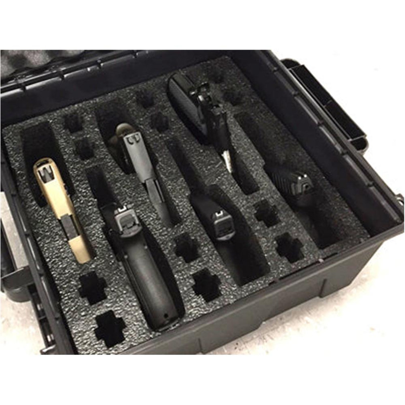 Hard case designed to store and transport up to 6 semi-automatic handguns with individual foam-lined compartments for each firearm. Features a water-resistant O-ring seal, flexible storage area for magazines and accessories, and triple-tabbed design for padlock security.