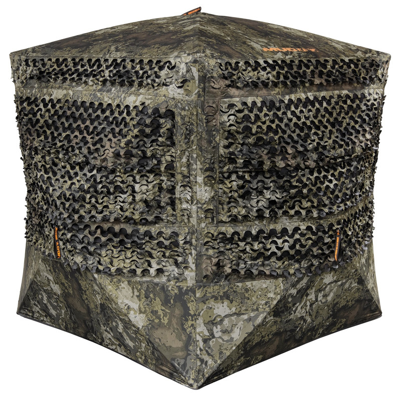 A three-person ground blind featuring Muddy's die-cut fabric pattern designed to break up the outline and blend into natural surroundings. The blind offers a 180° panoramic shooting window with one-way see-through mesh for optimal field of view and concealment during hunts.