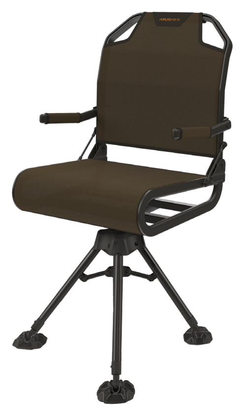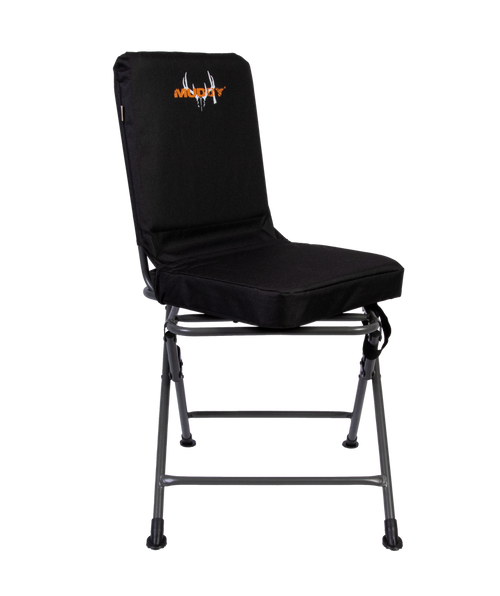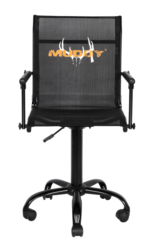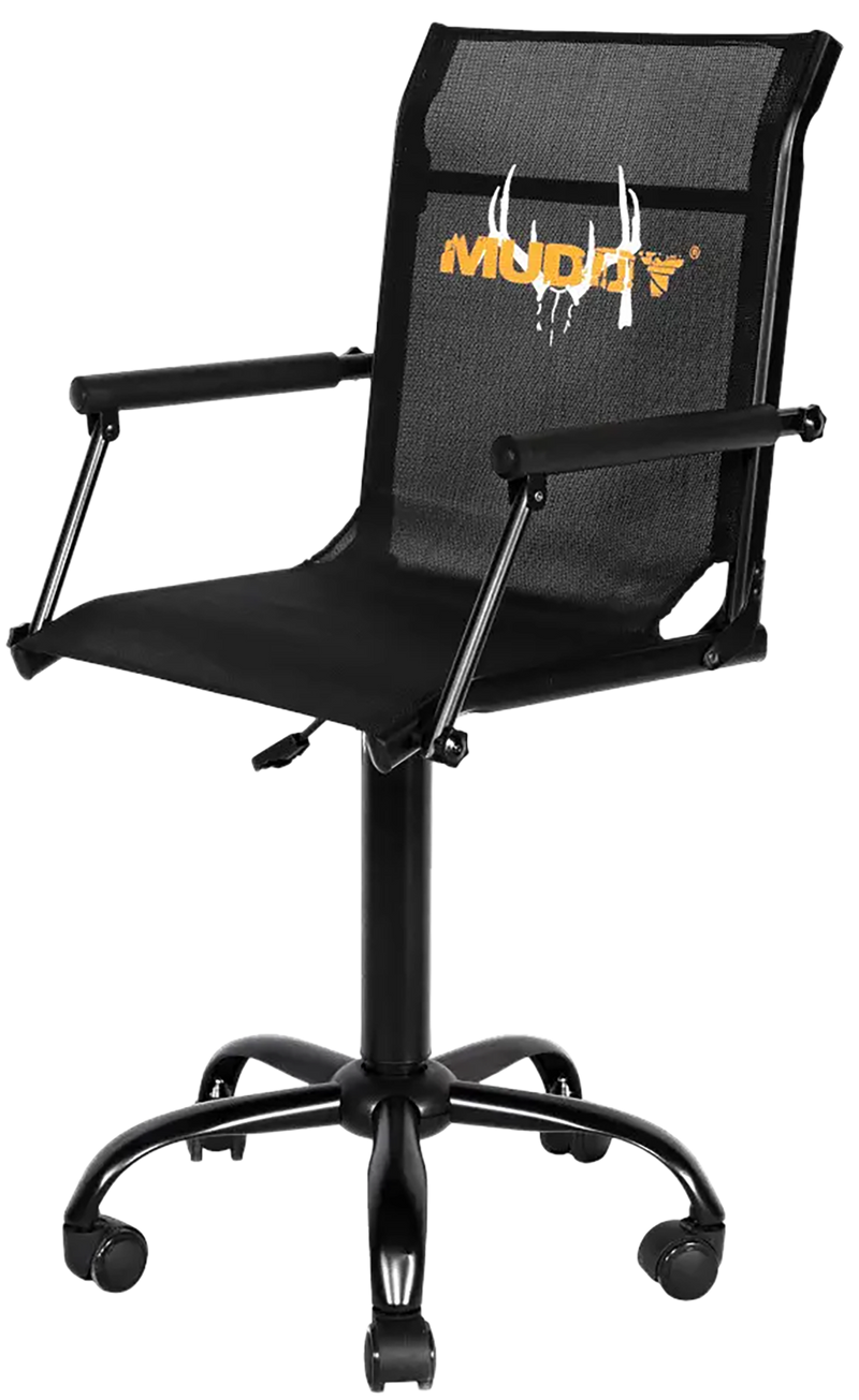 The Muddy Swivel Chair Roller is a black accessory constructed from durable Flex-Tek and steel materials, designed for use in hunting blinds and field setups. Measuring 23 inches long, 21 inches wide, and 7.8 inches high, this roller provides mobility and comfort for hunters spending extended time in the field. The swivel design allows for easy positioning adjustments while maintaining a low profile.