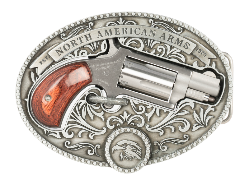 North American Arms Chuckwagon is a single-action mini-revolver chambered in 22 WMR with a 1.13" barrel and 5-round capacity. Features a stainless steel frame and barrel with rosewood bird's head grips, fixed sights, and weighs 6.2 oz. Includes a custom carry belt buckle holster that fits 1" to 1.5" belts.