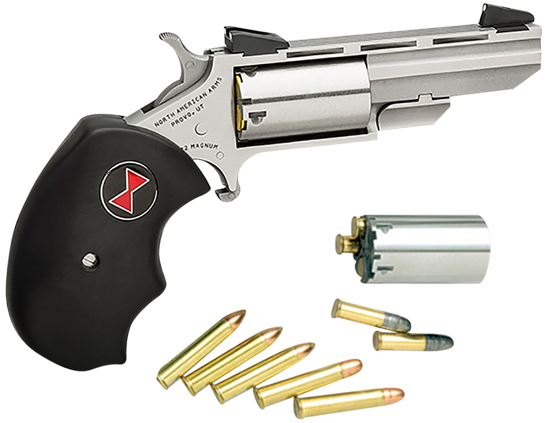 The NAA Black Widow is a single-action mini-revolver chambered in .22 LR/.22 WMR with interchangeable cylinders for dual-caliber flexibility. It features a 2" stainless steel vent rib barrel, stainless frame, and black finger-grooved rubber grip with fixed sights. This compact revolver weighs 8.9 oz and has an overall length of 5.88", making it suitable for personal protection and sport shooting.