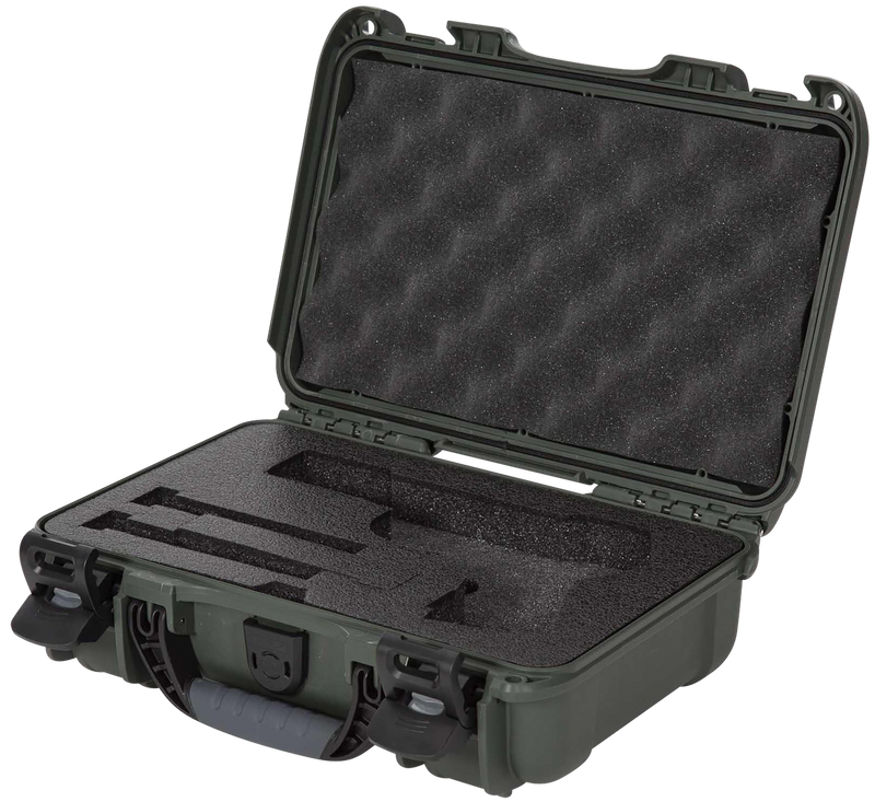 The Nanuk 909 Classic is a compact waterproof and airline-approved hard case designed for secure firearm storage and transport. Features closed-cell foam padding, lockable design, and floatable construction with interior dimensions of 11.44" L x 7" W x 3.68" H. Constructed from durable resin polyethylene in olive finish.