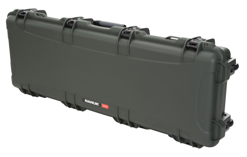 The Nanuk 990 is a hard resin protective case designed to accommodate tactical rifles and takedown shotguns, measuring 47.2" x 18.1" x 7.1". Features include foam padding, wheeled/handle hardware for transport, lockable closure, and floatable construction for durability and security.