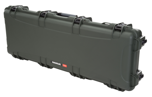 The Nanuk 990 is a protective polymer case designed to safely transport AR-15 rifles and up to 4 handguns. Features include foam padding, lockable latches, wheels and handle for mobility, and a floatable design. Interior dimensions are 47.5" x 18.1" x 7.1".