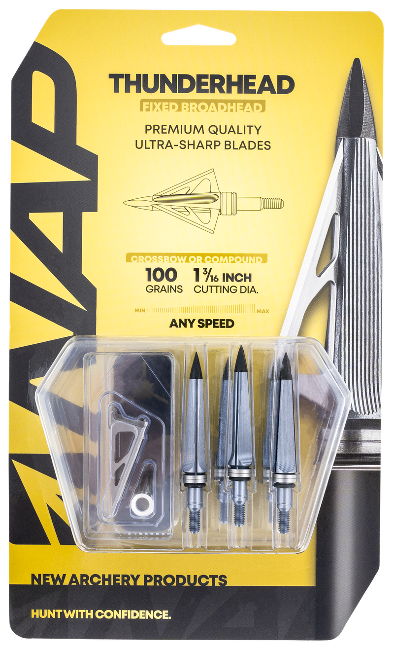 The NAP Thunderhead is a fixed-blade broadhead designed for crossbow use, featuring a 3-blade design with a 1 3/16" cutting width. This 100-grain broadhead comes in a 5-pack and delivers consistent accuracy for crossbow hunting applications.