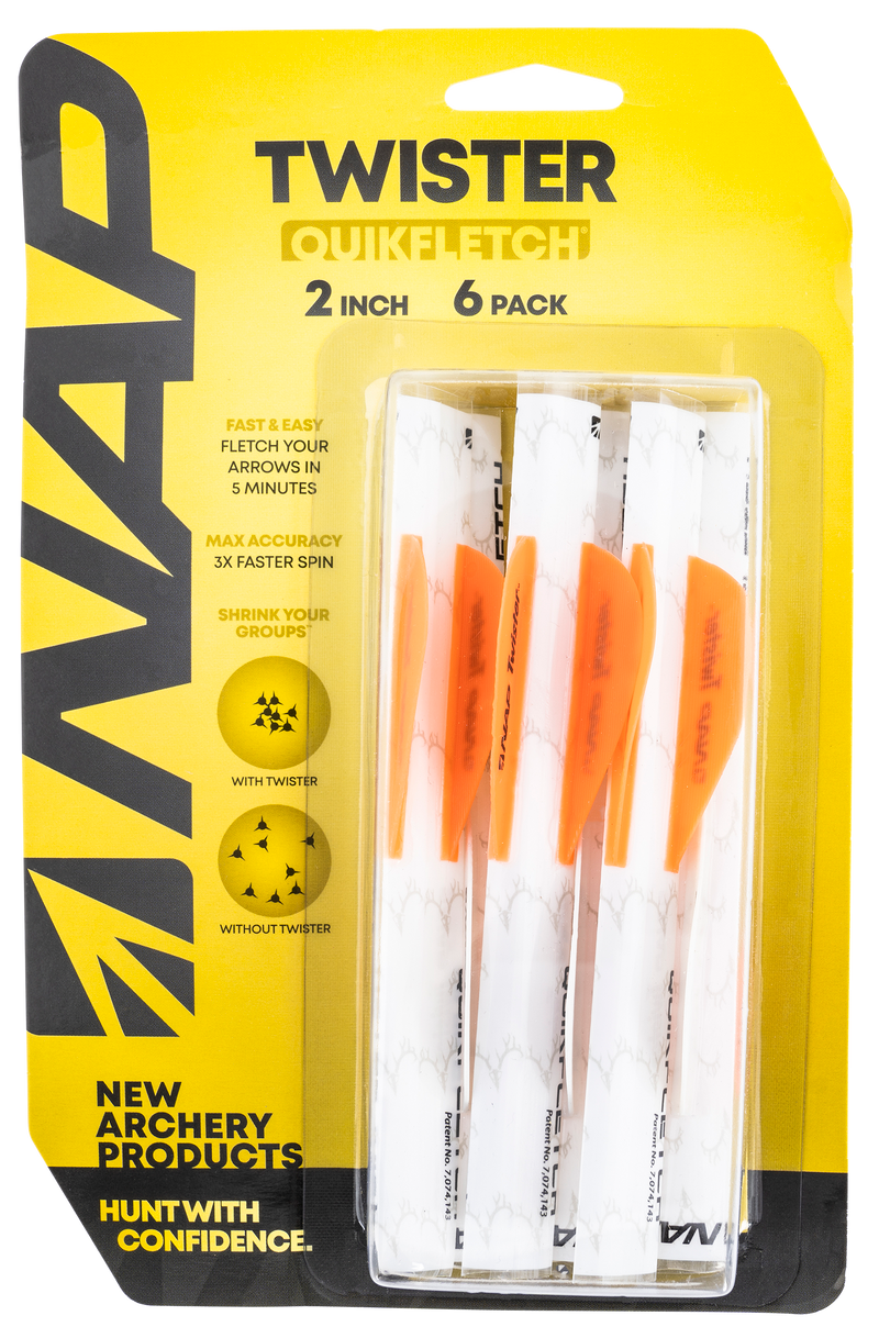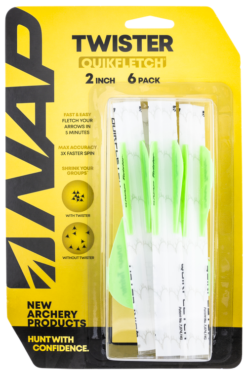 The NAP Quickfletch Twister vanes are fletching components designed for arrow assembly, featuring a white and orange color scheme with 2-inch length dimensions. These vanes measure 5.4 inches in width and 1.7 inches in height, provided in a 6-pack quantity for archers building or maintaining their arrows.