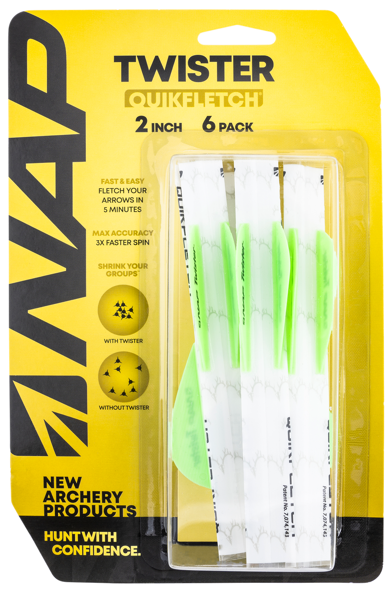 NAP Quickfletch Twister fletching in white and green colors, sold as a 6-pack. Designed for quick and consistent arrow fletching with dimensions of 2" length, 5.5" width, and 1.7" height. These adhesive-backed vanes provide reliable performance for archery applications.