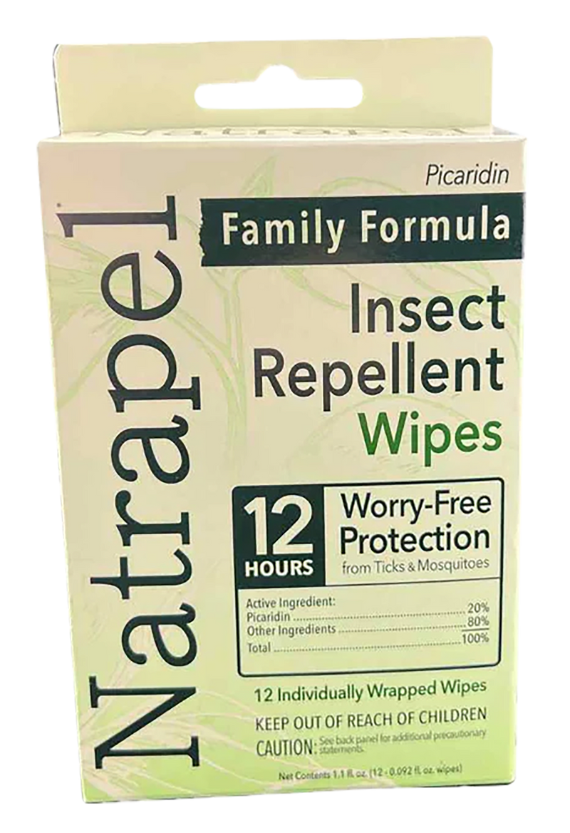 Natrapel repellent wipes contain picaridin and are designed to repel ticks and biting insects for up to 12 hours. Each box contains 12 individual wipes for convenient application during hunting and outdoor activities.