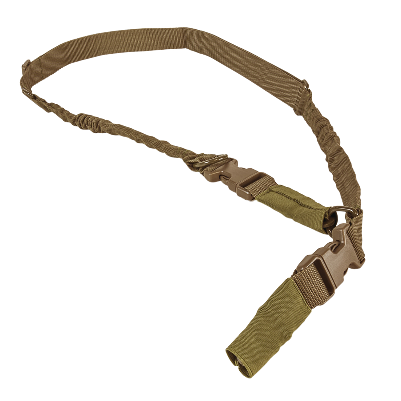 This tan nylon rifle sling features an integrated elastic shock-cord design that adjusts from 55" to 72" overall length, providing versatile carry and stability options. The 1.25" wide nylon strap with bungee shock-cord construction helps reduce recoil impact and allows for quick length adjustments during use. Ideal for tactical and hunting rifles requiring a durable, adjustable sling system.