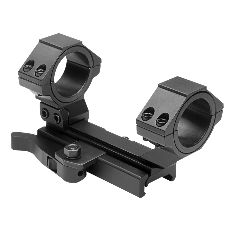 This is a 1-piece cantilever scope mount and ring combo designed for AR15 rifles with Picatinny/Weaver rails. It accommodates both 30mm and 1" scope tubes with included inserts, features a quick-release mechanism, and an adjustable rear ring for length customization. The black anodized aluminum construction provides a durable mounting solution for tactical and hunting applications.