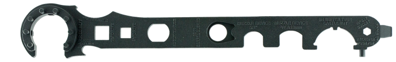 This is a multi-function armorer's tool designed for AR-15, M4, and M16 platform maintenance and upgrades. It features a barrel wrench for GI and free-float barrel nuts, spanner wrench, flash suppressor wrenches, castle nut wrench, buffer tube wrench, and flat blade screwdriver. The tool measures 12.9" in length and is constructed from black steel.