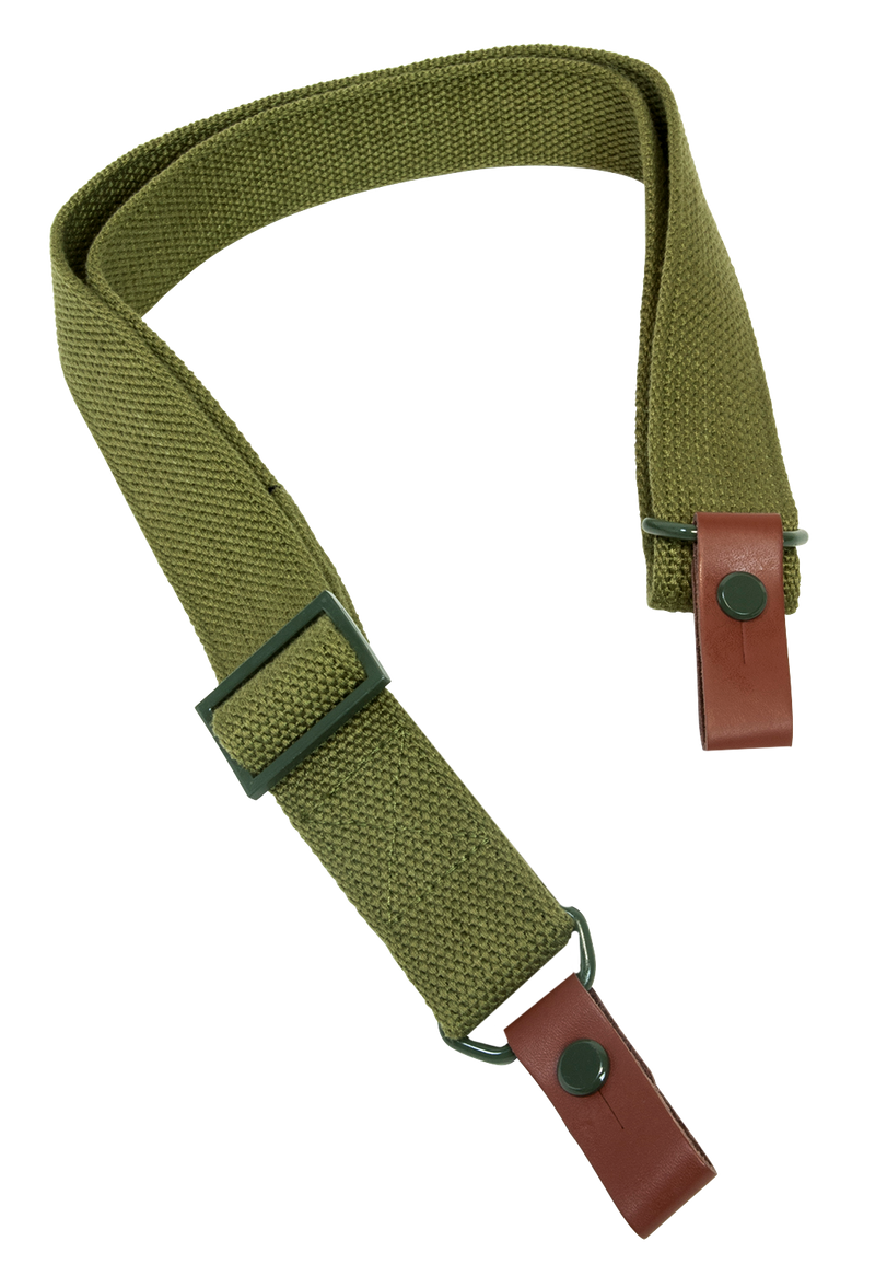 Military-style 2-point canvas sling designed for AK and SKS type rifles with adjustable length up to 42 inches. Features all-metal hardware, double-stitched construction, and reinforced sewn ends for durability. Includes metal slider for length adjustment and serves as a replacement for missing or worn factory slings.