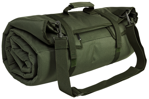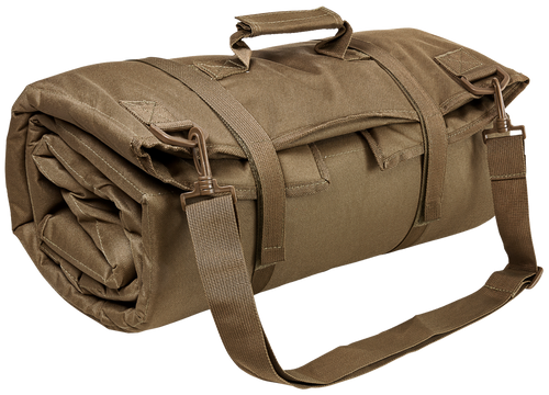 A 69"L x 35"W shooting mat constructed from PVC with .30" of padding for comfortable prone shooting positions. Features elbow and knee slip-resistant panels and rolls into a compact 19.5"W x 8.5"H bundle secured with hook and loop straps. Suitable for ground shooting or as camping padding under a sleeping bag.