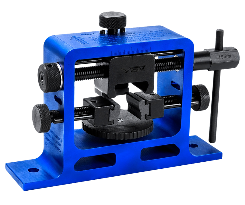 Universal pistol rear sight tool designed for removal, installation, and windage adjustment of dovetailed rear sights on most semi-auto pistol slides. Features an adjustable base platform to accommodate full-size, compact, sub-compact, and pocket-sized semi-auto pistols. Constructed with steel and aluminum components for durability.