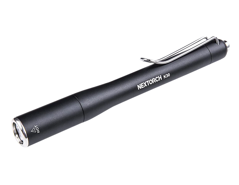 The Nextorch K30 is a compact LED penlight delivering 850 lumens of brightness in a black aluminum body measuring 7.6" long. This rechargeable flashlight features a 10880 Li-ion/AAA battery and offers waterproof protection, making it suitable for tactical, outdoor, and general-purpose lighting applications.