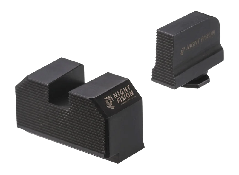 Night Fision night sights designed for Glock 17 and 19 MOS (Modular Optic System) slide cuts. These blacked-out sights feature tritium illumination for low-light aiming and are machined to precise specifications for reliable target acquisition in darkness. Compatible with standard Glock dovetail cuts on MOS-compatible frames.