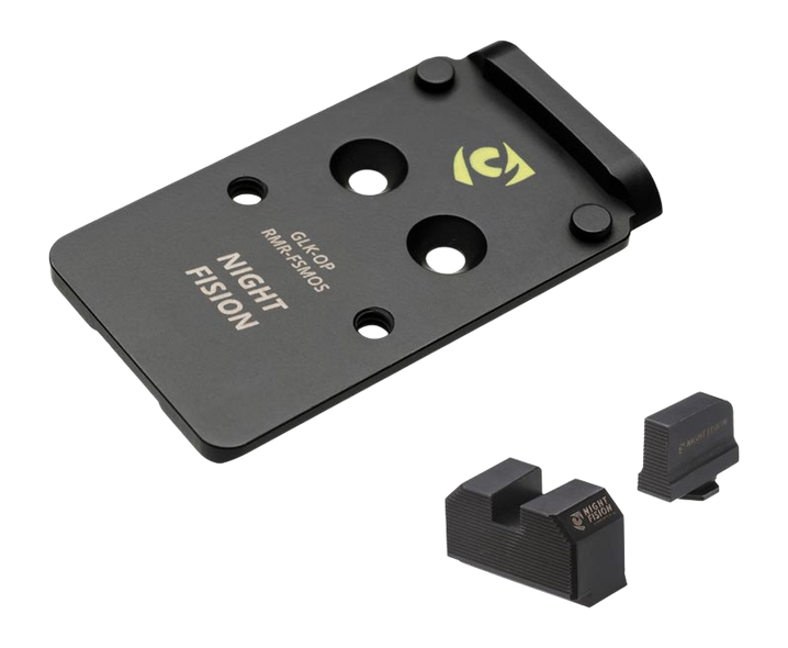 This combo package includes an RMR/507C optic mounting plate paired with Night Fision backup iron sights in black. Designed specifically for full-size Glock MOS (Modular Optic System) models 17 and 19, it provides both a mounting solution for popular compact optics and iron sight backup for co-witness aiming.
