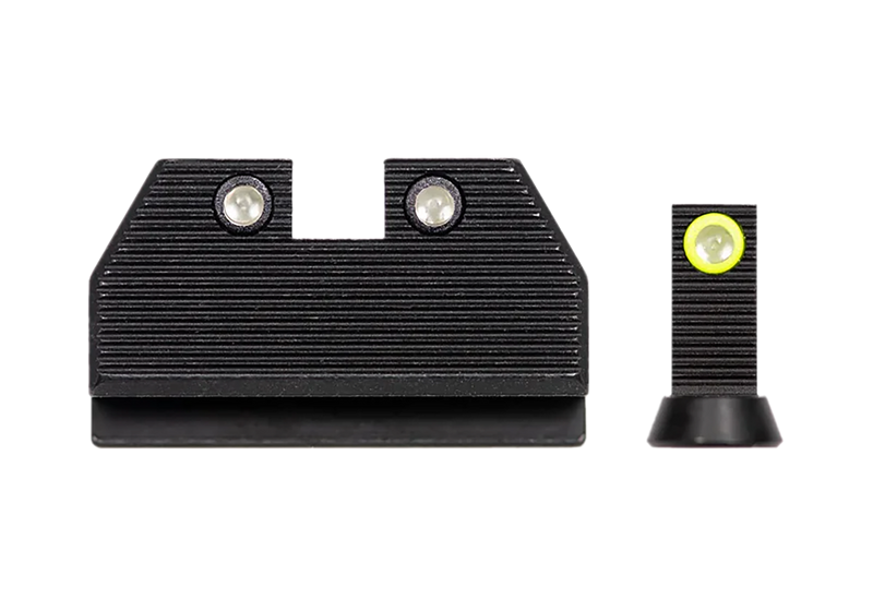 This night sight set is designed for CZ P-10 C/F/S pistols with optics-ready cuts and features green tritium front sight with yellow outline and green tritium rear sight with black outline. Night Fision's injection-molded design holds tritium vials securely and includes a domed lens for enhanced light collimation and a crisp sight picture. The serrated front sight reduces glare in bright conditions.