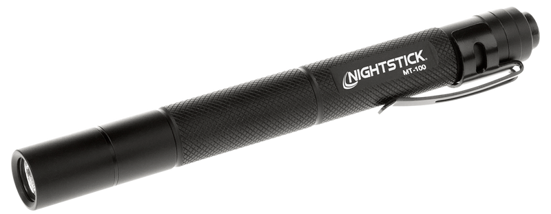 The Nightstick MT-100 Mini-TAC is a compact tactical flashlight producing 130 lumens with a tight long-throw beam for distance illumination. Constructed from aircraft-grade 6061-T6 aluminum with Type II hard anodized finish and IPX4 water resistance, it operates on 2 AAA batteries for approximately 1.5 hours of runtime. The tail-cap switch provides both momentary and constant-on functionality, and includes a removable pocket clip.